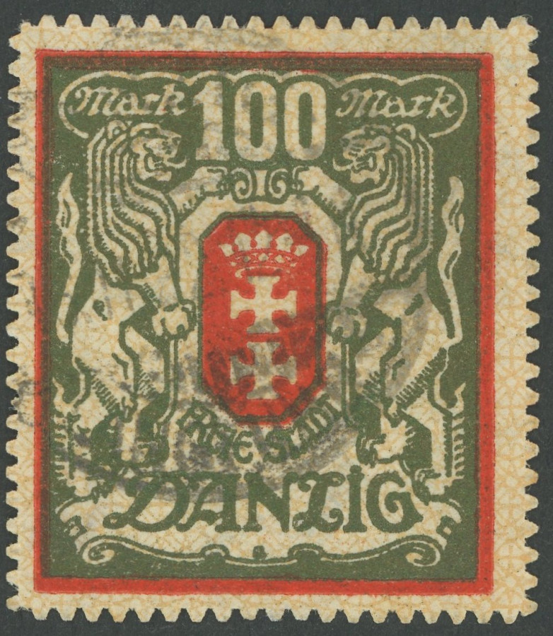 FREE CITY GDANSK. 1922, 100 M. dark vermilion / dark green olive, watermark 2 Y, superb, expertized Erdwien and Infla, Michel 350.-