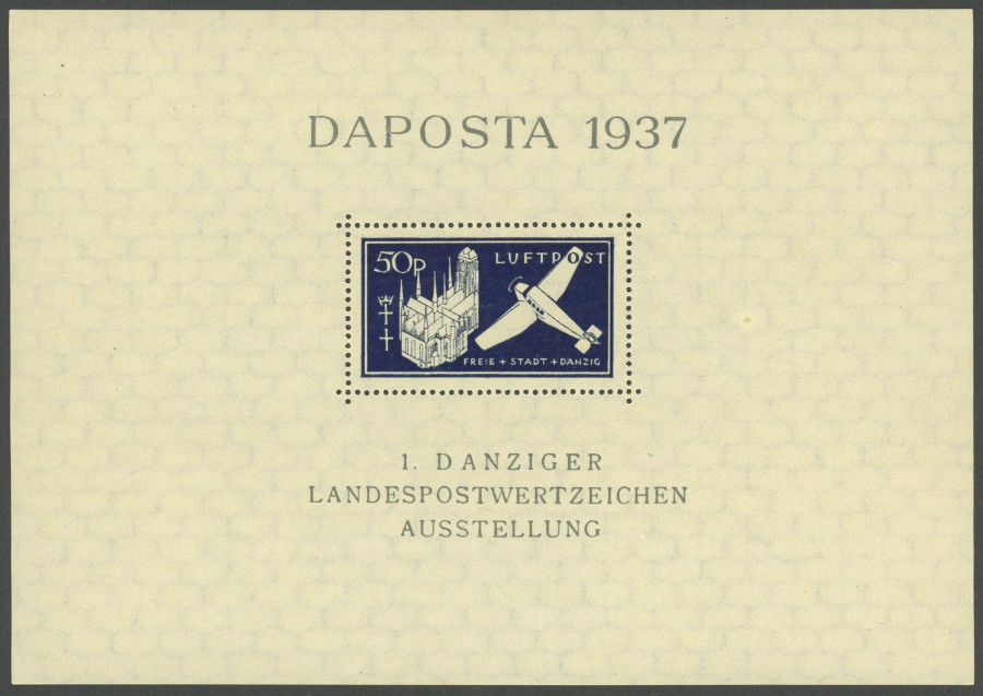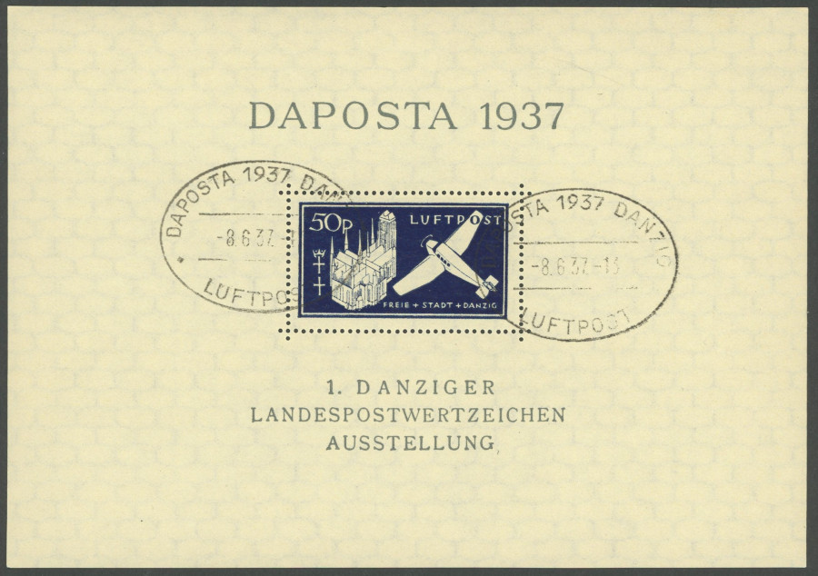 FREE CITY GDANSK. 1937, souvenir sheet DAPOSTA in black blue with plate flaw line between S and T in DAPOSTA, special cancel, superb, expertized Gruber, Michel 300.- (Image)
