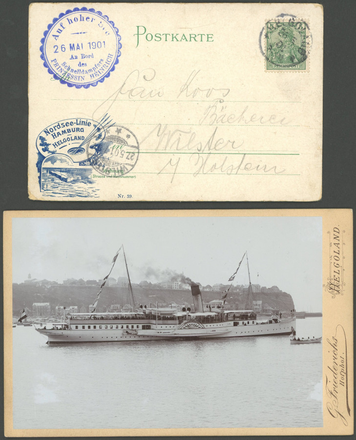 HELIGOLAND. 1901, 5 Pf. Reichspost on greatings from - card with single circle postmark Heligoland, additional cancellation on the high sea - aboard of the Schnelldanmpfers, in addition to it a old photo from fast