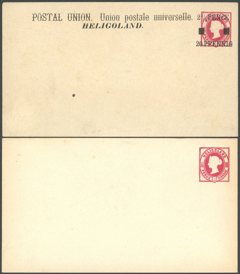 HELIGOLAND POSTAL STATIONERIES. 1879, 10 Pf. red and 2 ½ P. on 20 Pf. red, 2 unused covers, superb, Michel 63.- (Image)