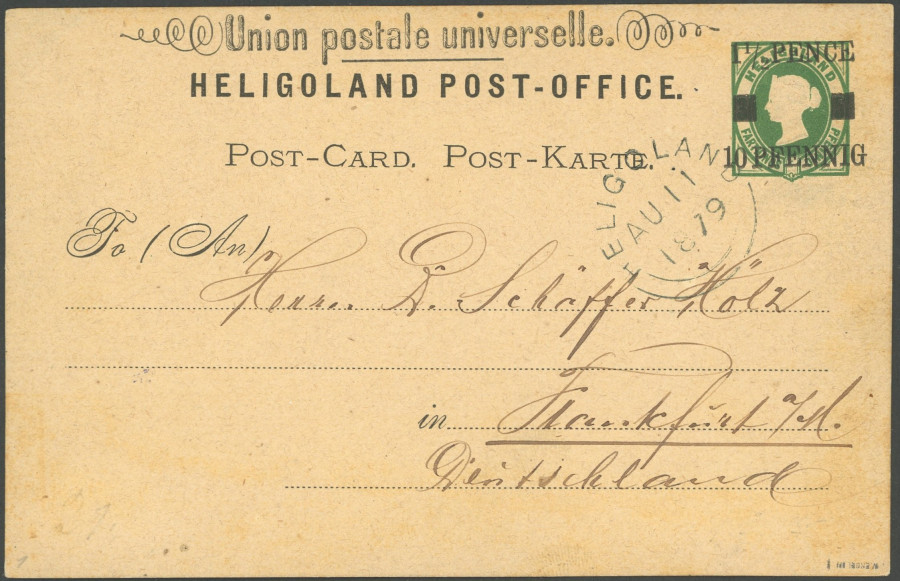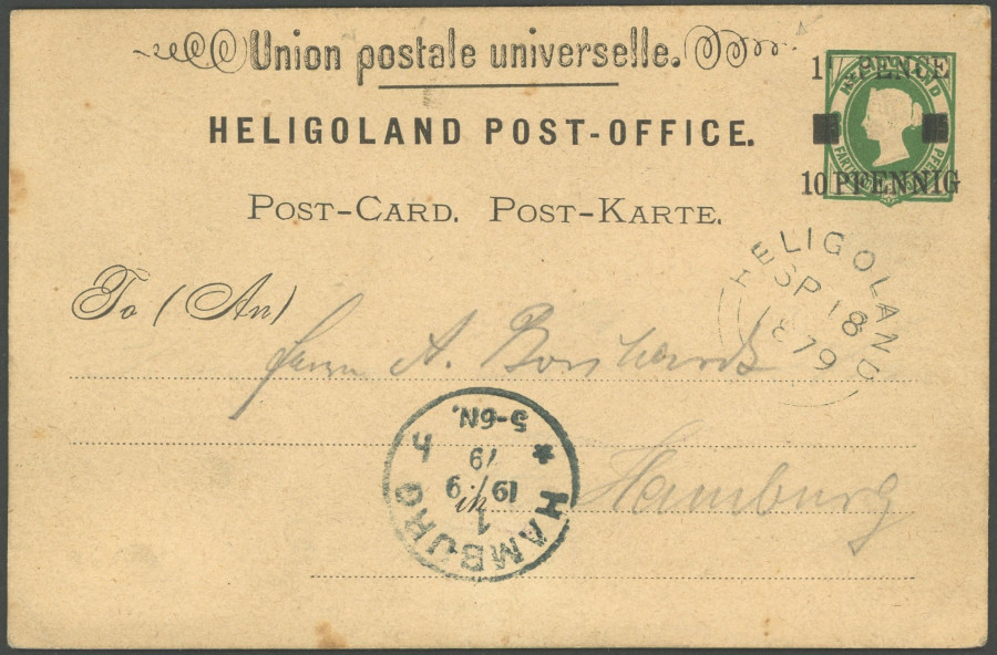 HELIGOLAND POSTAL STATIONERIES. 1879, 10 Pf. green, line 35 mm, superb postcard to Hamburg, expertized Schulz (Image)