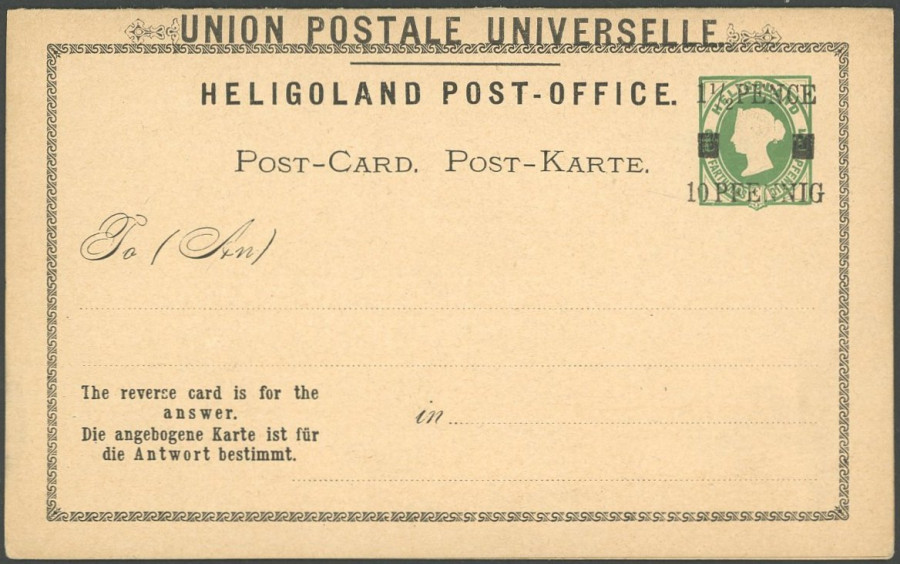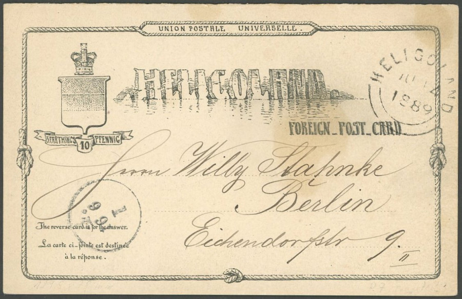 HELIGOLAND POSTAL STATIONERIES. 1889, 10 Pf. gray black, question part, card to Berlin, a little stained otherwise superb, expertized Schulz, Michel 200.- (Image)