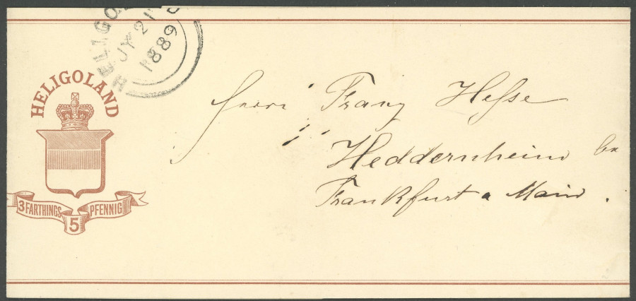 HELIGOLAND POSTAL STATIONERIES. 1889, 5 Pf. brown, wrapper to Heddenheim, superb, expertized sheriff, Michel 150.-
