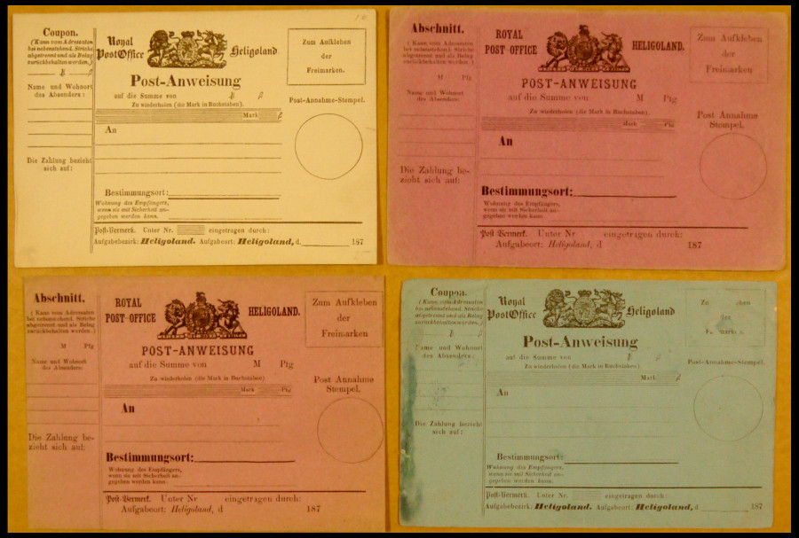 HELIGOLAND POSTAL STATIONERIES. 1875-80, 4 various unused post instructions, very fine / superb (Image)