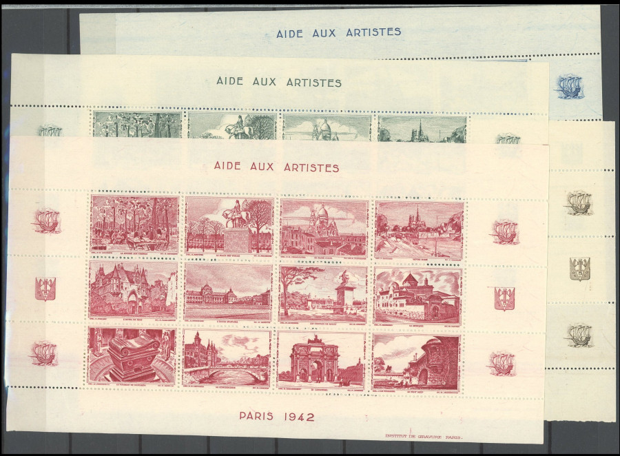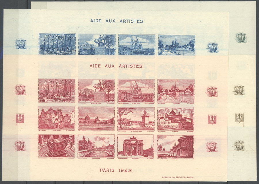 FRANCE. Paris 1942, Aide aux Artistes, 12 values in the miniature sheets with ornamental fields, imperforated, four miniatur sheets in different colours, mint never hinged, superb, R! (Image)