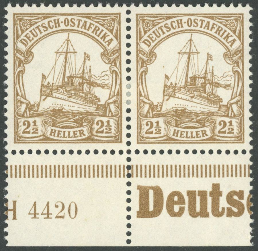 GERMAN EAST AFRICA. 1905, 2 ½ H. ochre-brown, o. watermark, in the horizontal lower margin pair with HAN H 4420, rest of hinge, superb, RRR! photo expertize Jäschke L, (these HAN was to the time of the certificate