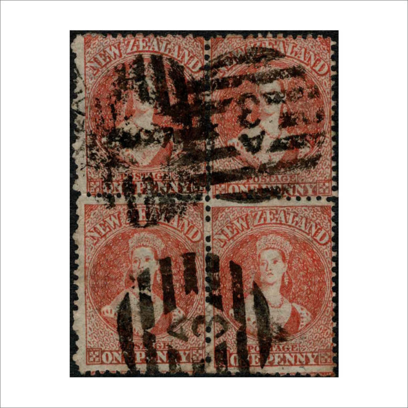 Orange-Vermilion SG 111/CP A1m(3) Block of 4 with A over 3 Obliterator heavier cancels. Scarce Multiple. (4) (Image)