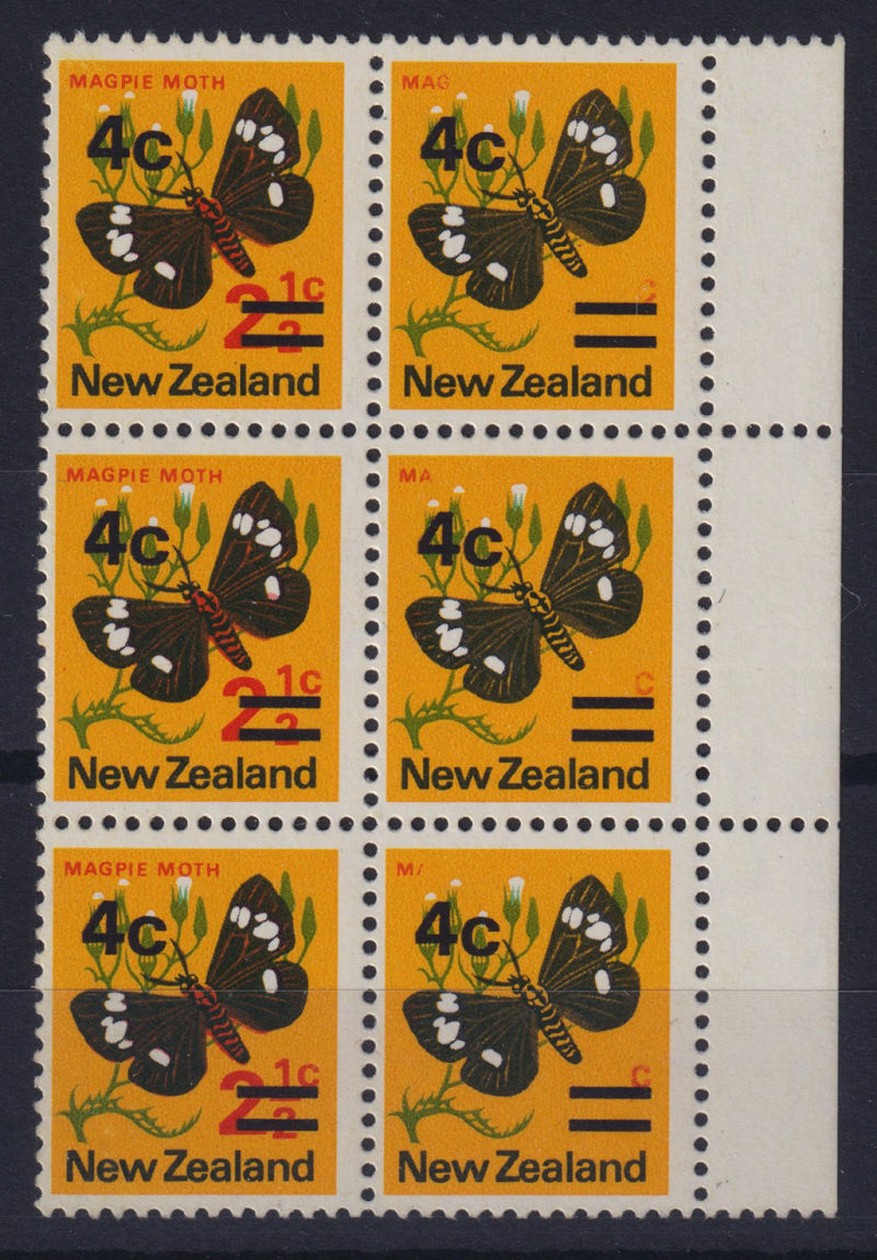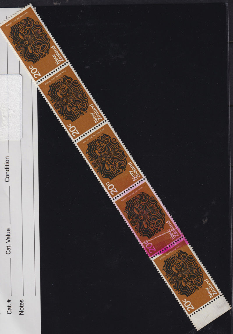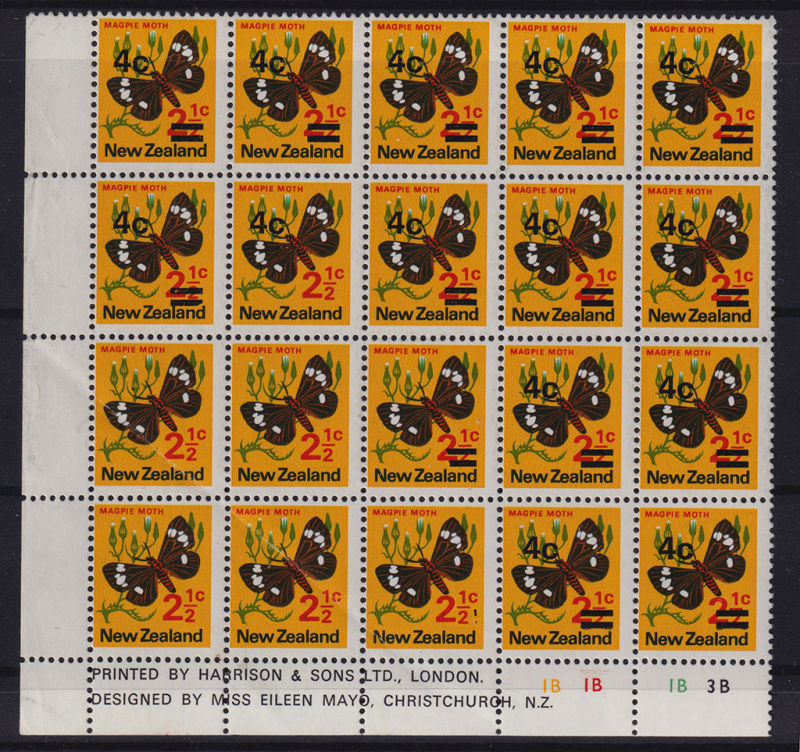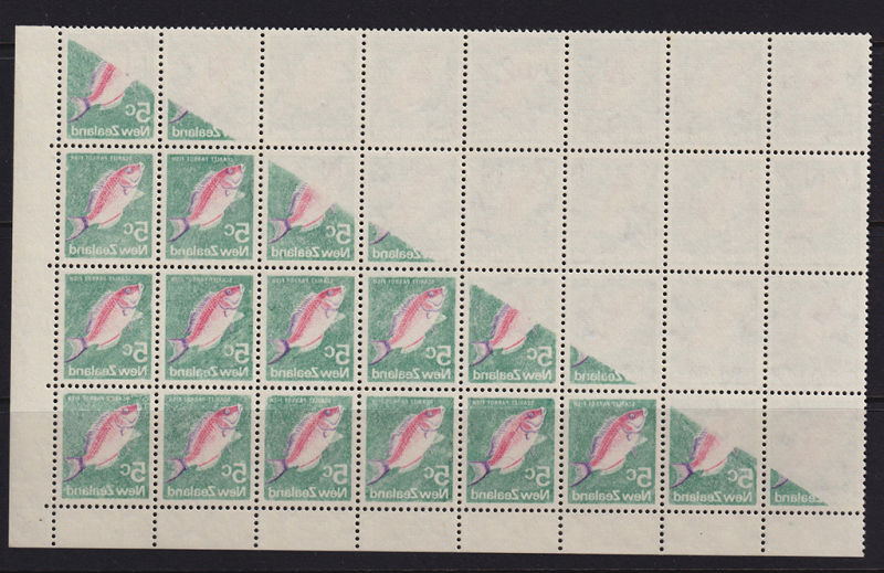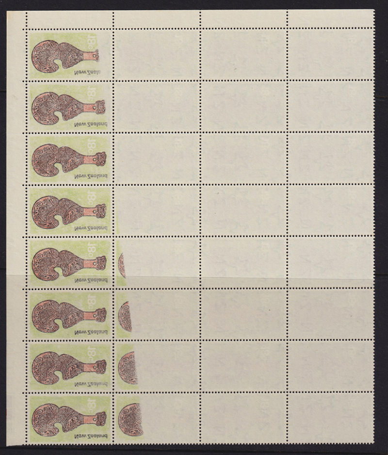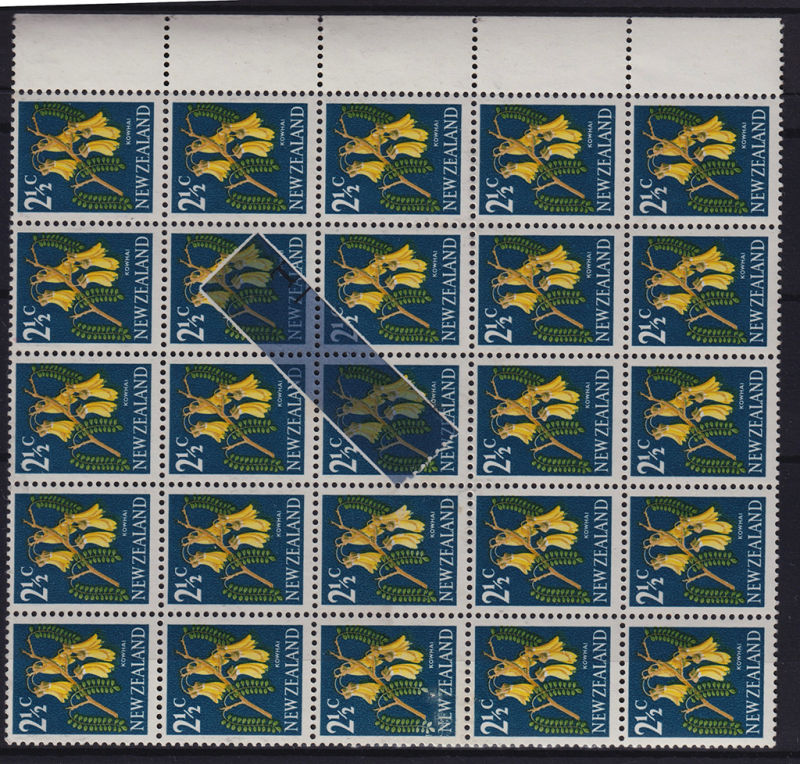 Right-hand Selvedge Block of 25 showing NZ Post Office Repatching on the front of the block affecting 4 stamps from Rows 2 & 3. The block is lightly hinged on 2 stamps and minor ageing. Fine & Unusual Error Block (25) (Image)
