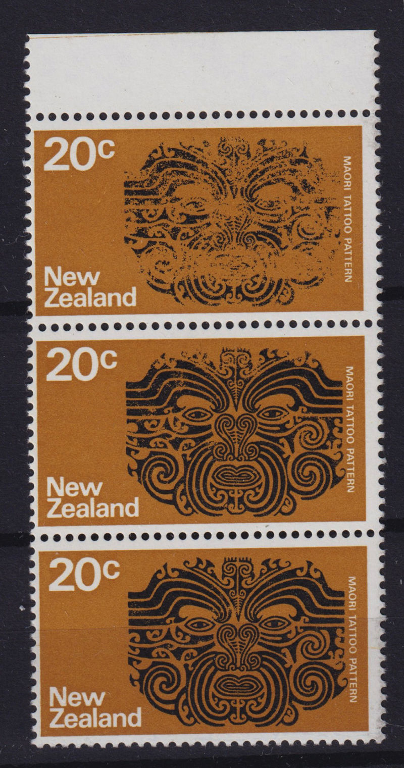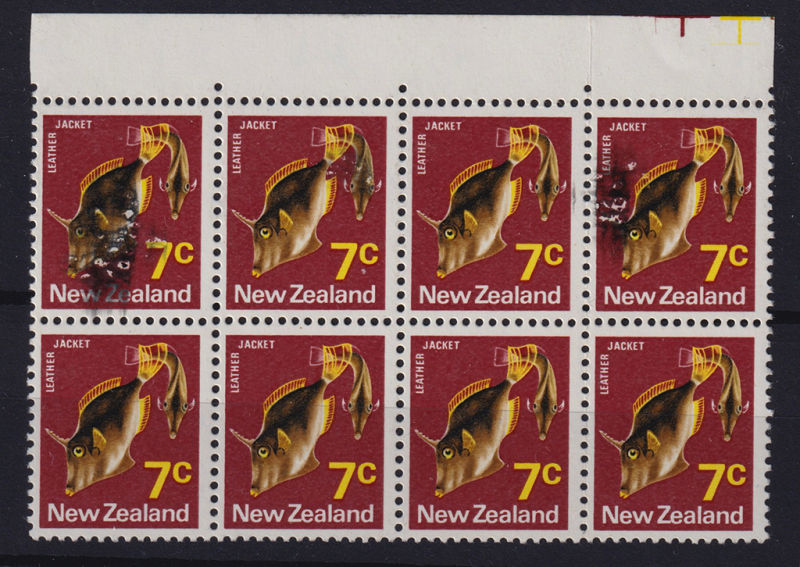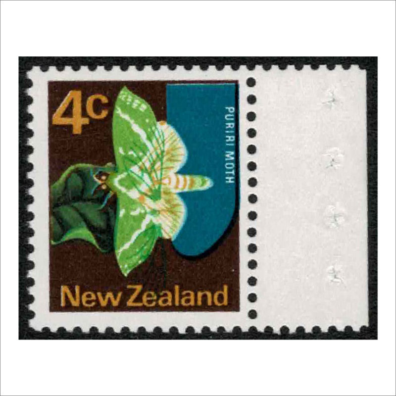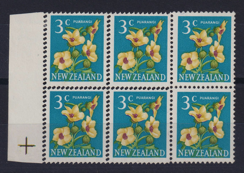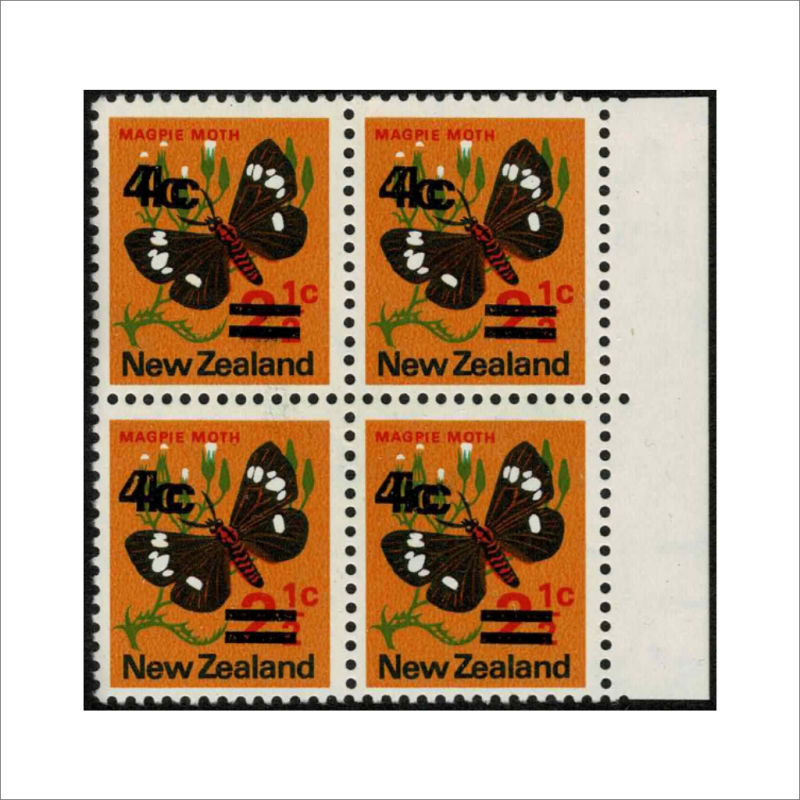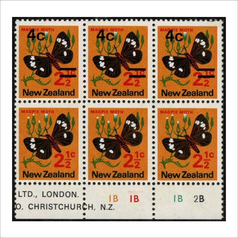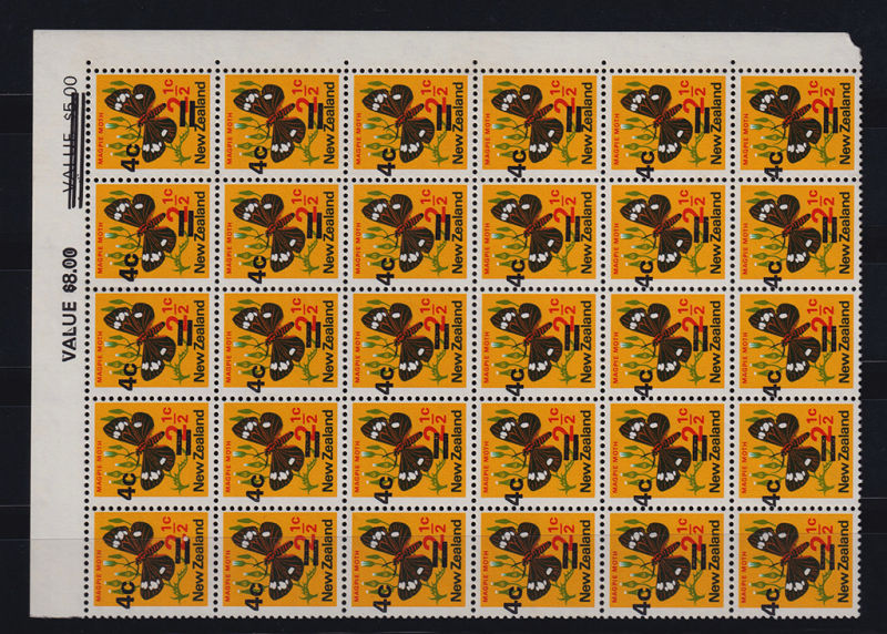 Right-hand Selvedge Block of 25 showing NZ Post Office Repatching on the front of the block affecting 4 stamps from Rows 2 & 3. The block is lightly hinged on 2 stamps and minor ageing. Fine & Unusual Error Block (25) (Image)