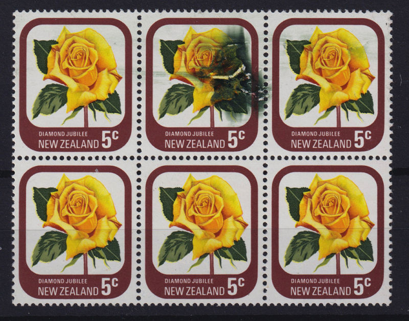 566 ** image1975 5c Rose Block of 6 with Striking Green Printing flaw affecting the top middle stamp of the block Unhinged (6) (Image)