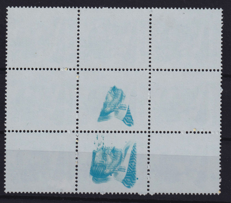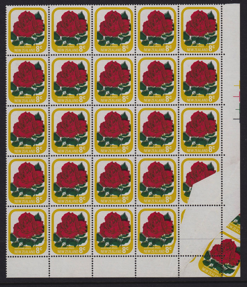 568 ** image1975 8c Rose CP PA8a Bottom Right Corner Block of 25 with a Spectacular Striking Paper Fold Error affecting the bottom 2 right stamps and much of the design missing and printed in the far right corner. A Rare Exhibition Piece (25) (Image)