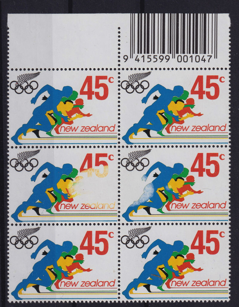 574 ** image1992 45c Olympic Design Top Selvedge Block of 6 with a DRYPRINT on the centre two stamps Unhinged (6) (Image)