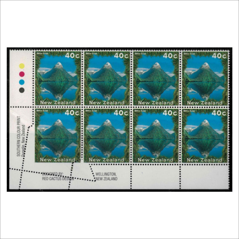 575 ** image1996 40c Mitre Peak Imprint Block of 8 with Striking Paper Fold afeecting the bottom 2 stamps Unhinged (8) (Image)