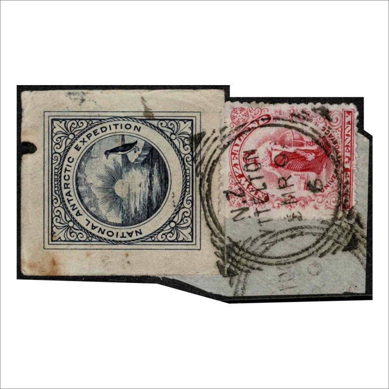 579 U image1903 (25MR) National Antarctic Expedition label showing penguin on iceflow/sunset in Dark Blue Heslop E3 tied on small piece by Lyttelton cancel. The label has a slight fault at top. Very Scarce. (1) (Image)