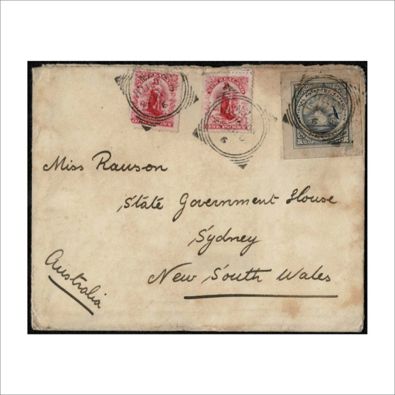 580 C image1903 (25MR) Printed Discovery Antarctic Expedition 1901 envelope with ‘National Antarctic Expedition’ showing Penguin on iceflow/sunset label in dark blue Heslop E3 tied by Lyttelton cancels with 2x 1d Universal stamps to Sydney. Backstamped Christchurch,Sydney & Sutton Forest cancels. The cover has light ageing. Rare Cover. (1) (Image)