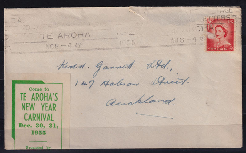 Aroha’s New Year Carnival Dec 30,31 1955 Promoted by Te Aroha 5000 Club Imperf Green/White label untied on Cover Posted at Te Aroha to Auckland. Slight faults at top (1)
