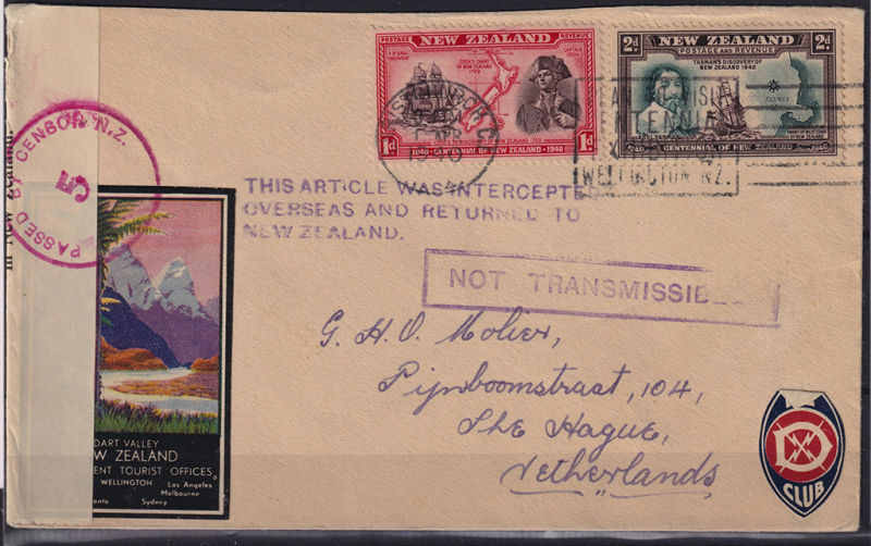 843 C image1940 (1AP) Censored Cover to Netherlands with 1940 1d & 2d Centennial stamps Posted at Christchurch. Has ‘This Article was Intercepted Overseas and Returned to New Zealand’ & ‘Not Transmissible’ boxed violet cachet. Has DX Club & NZ Tourist Office labels. (1) (Image)