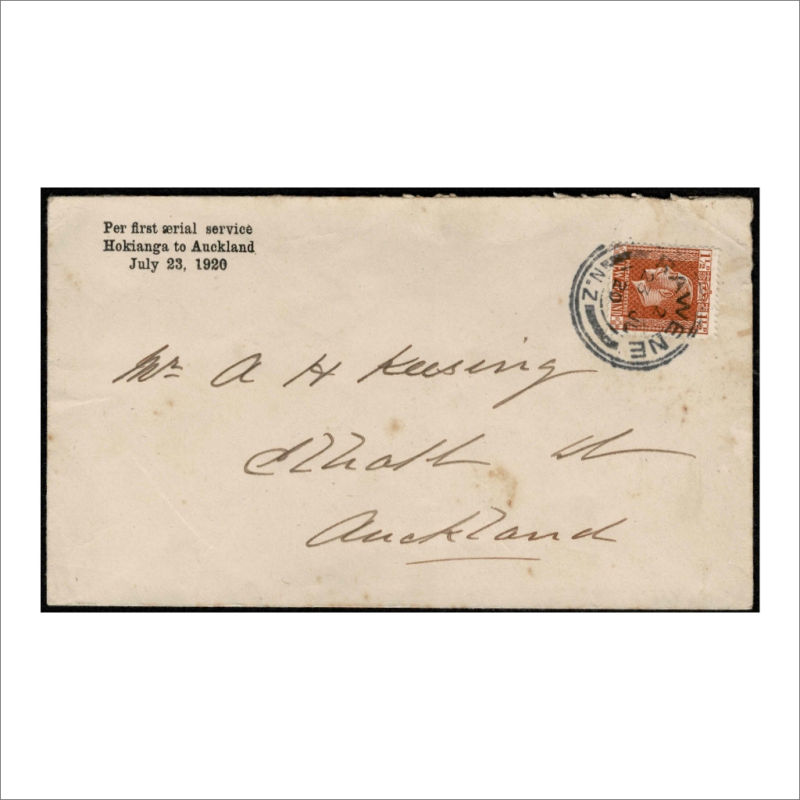 846 C image1920 (23JL) First Flight Cover ‘Per first aerial service/Hokianga to Auckland/July 23,1920’ Printed at top left. Rawene to Auckland flight NZAMC #22f. Has Cooper & Son/Big Drapery Stores/Rawene Cinderella label on the back untied. The Cover has light ageing. Very Scarce (1) (Image)