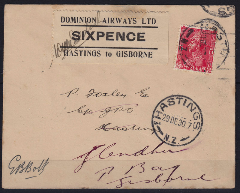 847 C image1930 (29DE) Dominion Airway Ltd/Sixpence/Hastings to Gisborne with 1d FM tied by Hastings cancel to Gisborne. Signed by GB Bolt. Non Verne Collins Cover. Light stain at top. (1) (Image)