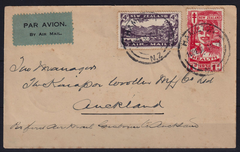 848 C image1931 (10DE) Airmail Cover endorsed ‘Per Airmail Gisborne to Auckland. Has 4d Air & ‘31 1d Red Boy tied by Hamilton. Backstamped Auckland. Also has Kaiapoi Woollen Goods Kiwi label untied. The cover has light ageing (1) (Image)