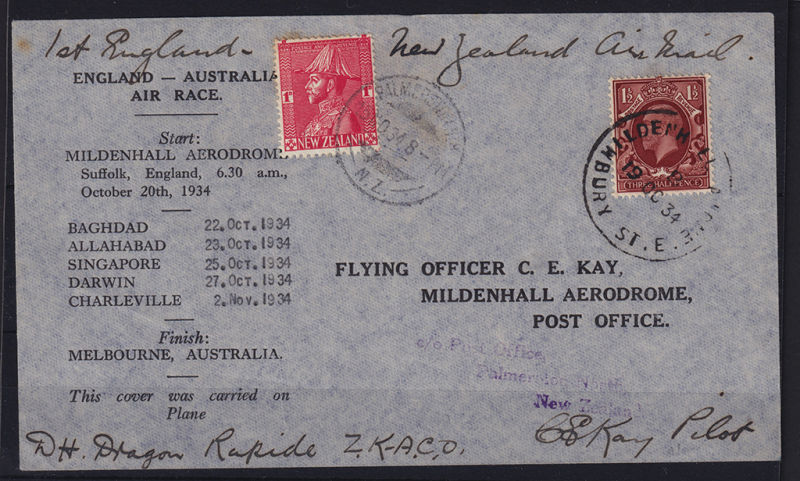 851 C image1934 (19OC) MacRobertson Centenary Air Race Printed Cover endorsed ‘DH Dragon Rapside ZKACO signed by CE Kay Posted at London and has additional 1d FM tied by Palmerston North cancel. (1) (Image)