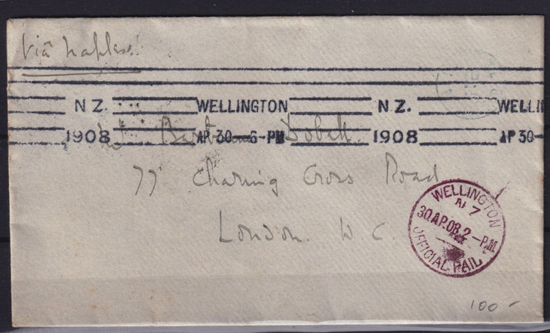 852 C image1908 (AP30) W&G Turnbull & Co Printed Cover with 1d Black Meter cancelled by Wellington machine cancel to London. Also Wellington Official Paid red cancel. Backstamped London W.C. (1) (Image)