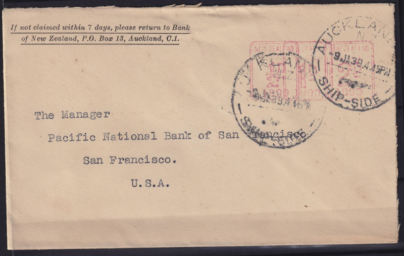 853 C image1939 (9JA) Bank of NZ Printed envelope to USA with 1/2d,1d,2d Red Meters cancelled by Auckland Ship-side cancels. No backstamps. (1) (Image)