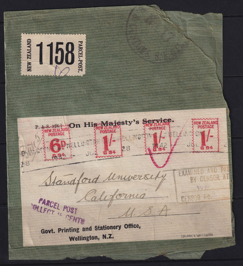855 C image1942 (JL28) Large Parcel Piece with OHMS/Govt Printing and Stationery Office Wellington NZ Printed label to USA with Red 6d,1/-(3) Meters cancelled by Wellington machine cancel. Also has violet ‘Parcel Post/Collect 15 Cents’ cachet. On the back has a Customs Declaration Form plus US 5c & 10c Dues tied. (1) (Image)