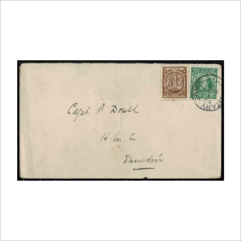 856 C image1913 (18AP) Cover with KEVII 1/2d Green plus untied Otago Mobilsation label addressed to Capt P Doull,HMC,Dunedin. Used at Sutton Military Camp. Territorial Mail. No backstamps and missing the flap. Scarce (1) (Image)
