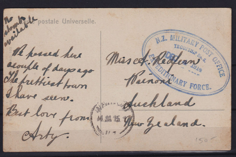 857 C image1914 (DE4) Port Said Picture Postcard Stampless to NZ with fine blue oval ‘NZ Military Post Office/Troopship No 8/Expeditionary Force’ Used on HMNZ T Star of India. Has Wainoni 14 JA 15 receiving cancel. Fine Troopship WW1 Card (1) (Image)