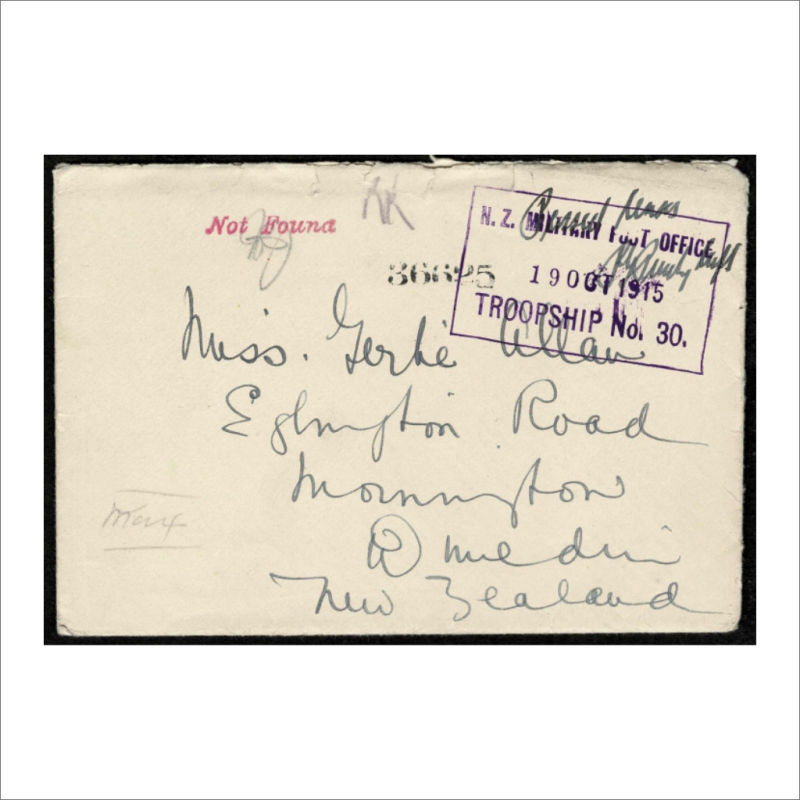 858 C image1915 (19OC) Stampless Cover to NZ with fine ‘NZ Military Post Office/Troopship No 30’ boxed handstamp Used on HMNZT Maunganui. Has Not Known red cachet at top. (1) (Image)