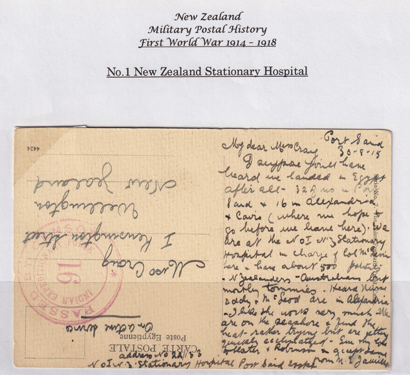 859 C image1915 (30AU) Stampless Postcard endorsed ‘No.1 New Zealand Stationary Hospital’ written by Staff Nurse Mabel Jamieson of Kumara at Port Said to NZ. Interesting message about the hospital and patients. Has the Red Indian Expeditionary Force large censor. (1) (Image)