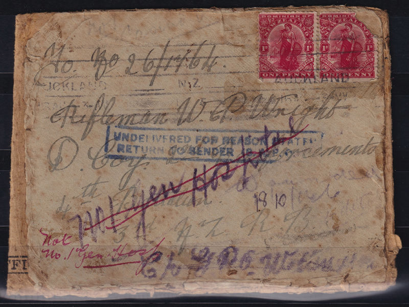 860 C image1916 (18AU) Unclaimed Cover with 2x 1d Dominion Stamps Posted at Auckland addressed to Rifleman WP Wright,D Coy,2nd Reinforcements,4th Battalion,3rd NZRB. Has ‘Undeliverable For Reason Stated/Return to Sender’ boxed handstamp. Has been readdressed with no backstamp. Some staining (1) (Image)