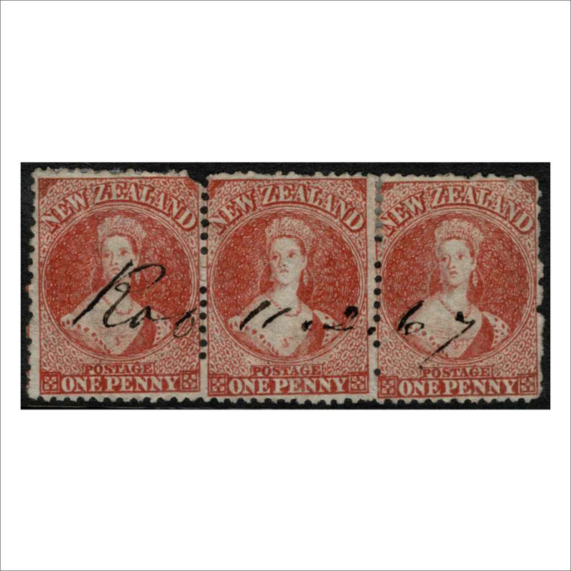 Horizontal Strip of 3 with complete ROSS 11.2.67 Manuscript cancel. Greymouth District PO Open 1865. One stamp has a damaged top right corner. Nice cancel (3) (Image)
