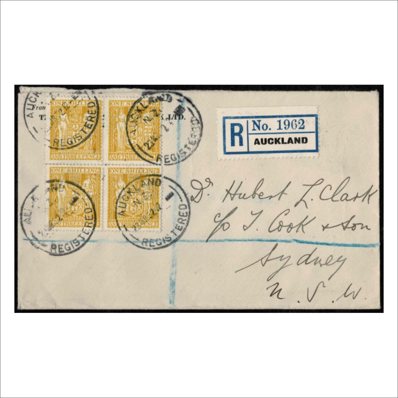 Lemon SG F145 Registered Cover with a Block of 4 tied by Auckland Registered 23 MR 32 cancels to Sydney,Australia. Fine & Scarce Multiple on Cover. ACS Cat $400 as singles (1)