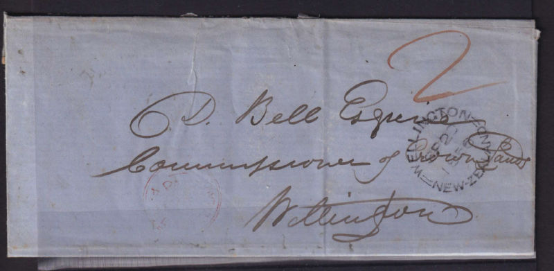 Outer Wrapper addressed to D Bell Esq, Commissioner of Crown Lands, Wellington. Rated ‘2’ Manuscript in Red. Has a light Paid At Petre Red Crown Circle handstamp. Has Wellington/NZ unframed SP 20 1856 receiving cancel. Backstamped Petre unframed