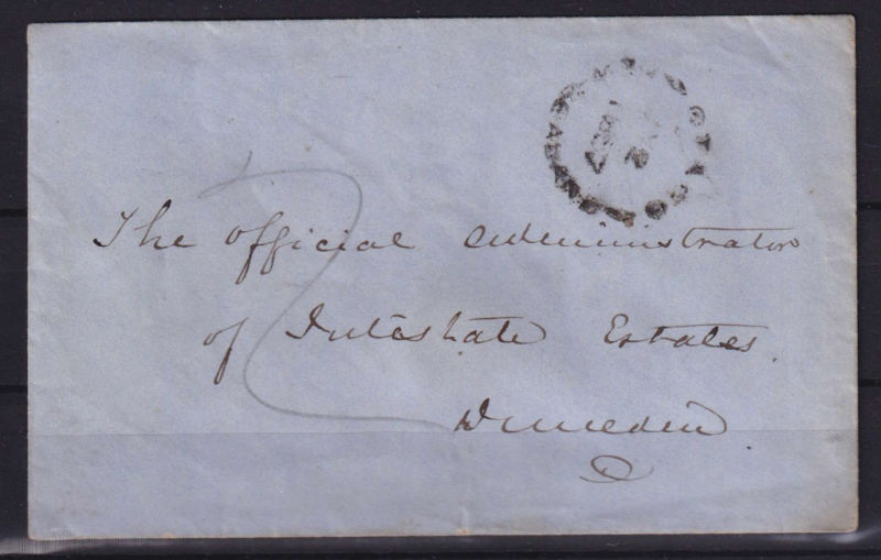Stampless Cover with Unframed OTAGO/N ZEALAND cancel addressed to The Official Administration of ? Late Estates, Dunedin. Rated ‘2’ in manuscript. No backstamp. (1)