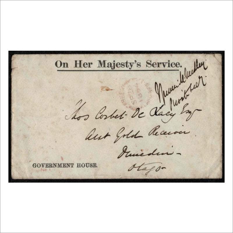 OHMS/Government House Small envelope addressed to Thos Corbet De Lacy Esq, Asst Gold Receiver, Dunedin, Otago. Has FREE/AUCKLAND Red unframed cancel. Backstamped Dunedin.The cover is lightly aged. Very Scarce FREE Auckland cancel (1) (Image)
