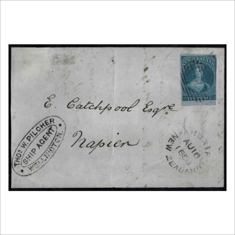 addressed to E Catchpool Esq, Napier with 2d Blue SG 5 cancelled by Obliterator ‘10’ (Wellington) cancel with Ahuriri unframed arrival cancel. Also Thos W Pilcher/Ship Agent/Wellington cachet at left. (1) (Image)