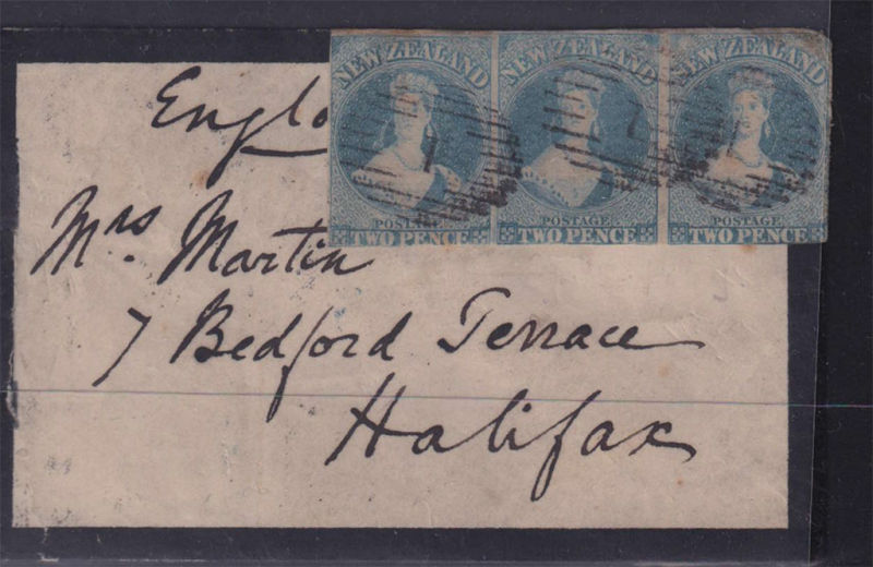 Mourning Cover to Halifax, England with Imperf 2d Blue Horizontal Strip of 3 cancelled by Obliterator ‘1’ (Auckland) cancels. Backstamped Auckland & Halifax cancels. The cover carried on the ‘Columbian’ to Suez connecting with the ‘Ripon’ leaving