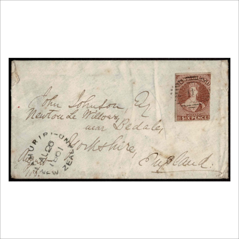 Cover with QV 6d Brown SG 13 tied by Obliterator ‘11’ with Ahuriri unframed cancel at bottom left addressed to John Johnson,Near Bedale,Yorkshire,England. Backstamped Bedale. The stamp has 2 Margins. The cover has a slight fault at top left, minor