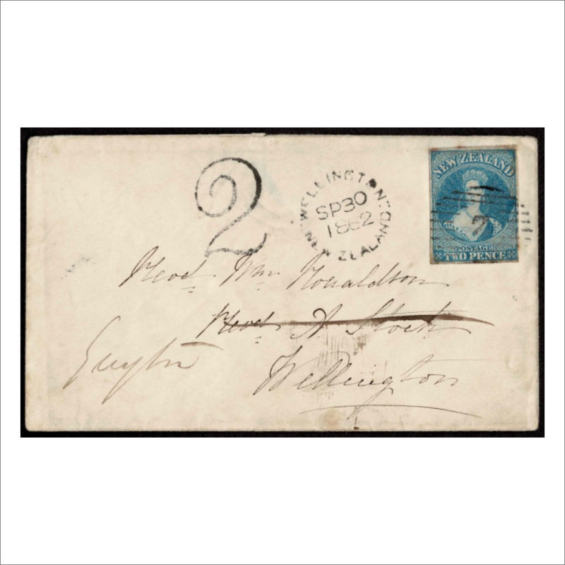 Local Mail Cover with Imperf 2d Blue SG 9 tied by Obliterator ‘7’ cancel with a Wellington unframed cancel at left. Also ‘2’ Numeral handstamp at left. The cover has been redirected. Minor ageing. No backstamp. (1) (Image)