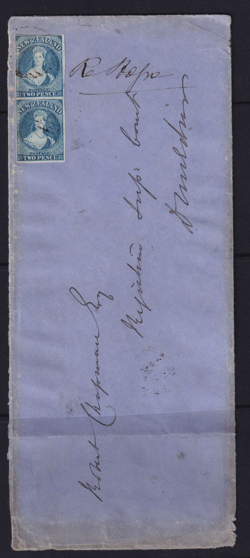 Cover with Imperf 2d Blue SG 96 Vertical Pair tied by light Obliterator cancel addressed to Robert Chapman, Register ? Court, Dunedin. Backstamped Invercargill & Dunedin/Otago Red receiving cancels. The stamps has 4 Clost to Good margins. The cover