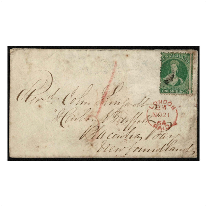 Cover to Newfoundland with untied 1/- Green stamp (corner fault). The cover has light ageing and soiling. Has London/Paid NO 21 64 transit cancel. Backstamped Dunedin & St Johns/Newfoundland cancels. (1) (Image)