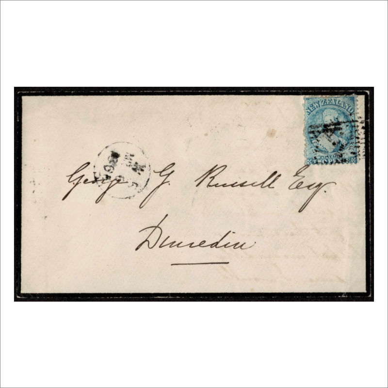 Mourning Envelope addressed to George G Russell Esq, Dunedin. Has Perforated 2d Blue SG 113 tied by indistinct Boxed ‘4’ (Greytown) Oblitterator. Has at left ‘W5’ Letter-number datestamp. (W5 used at Greytown). Backstamped Wellington & Dunedin red