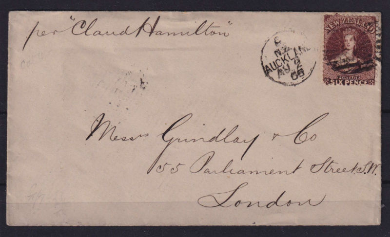 with Perforated 6d Red Brown SG 122 tied by Auckland duplex cancel addressed to the Bank ‘Grindlay & Co, London’. Endorsed Per ‘Claude Hamilton’ Backstamped London. (1)