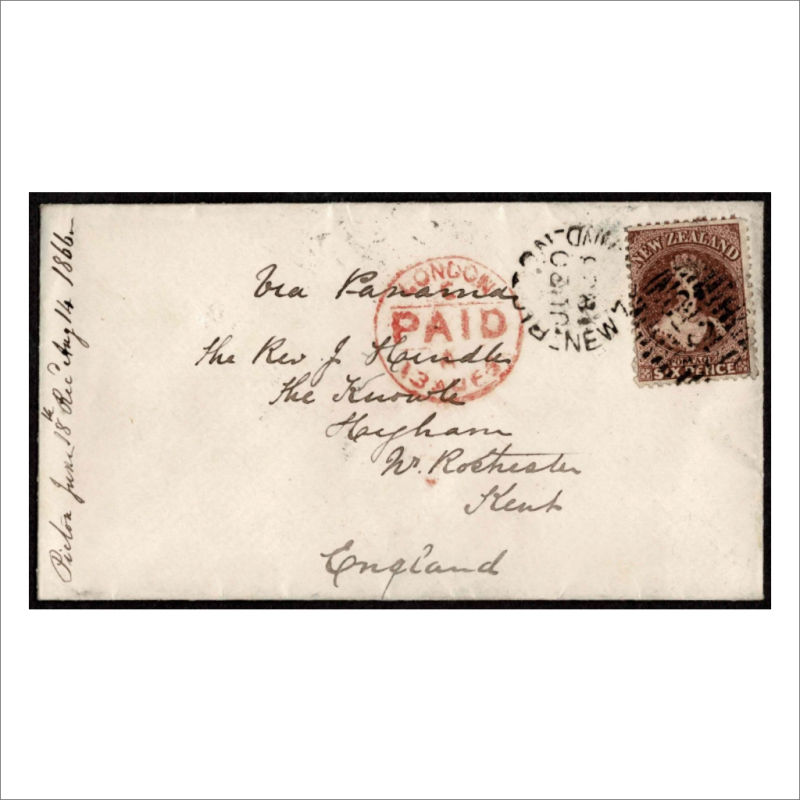 Cover endorsed ‘Via Panama’ with Perforated 6d Red Brown tied by PICTON Obliterator cancel plus alongside an unframed Picton cancel addressed to Rev Joseph Hindle,The Knowle,Kent,England’. Has London Red Paid cancel on the front. Backstamped