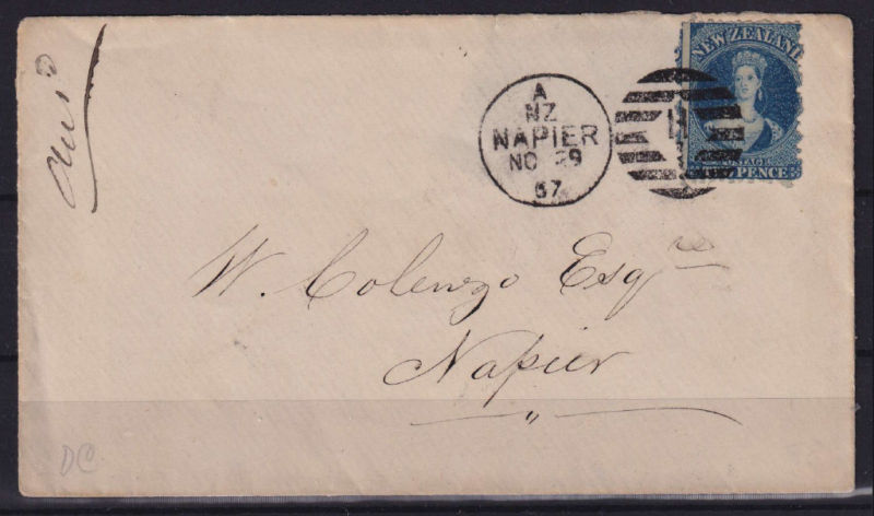 Local Mail Cover with Perforated 2d Blue SG 114 tied by Napier/H1 cancel address to W Colenso Esq, Napier (Early Christian Missionary) Fine condition (1) (Image)