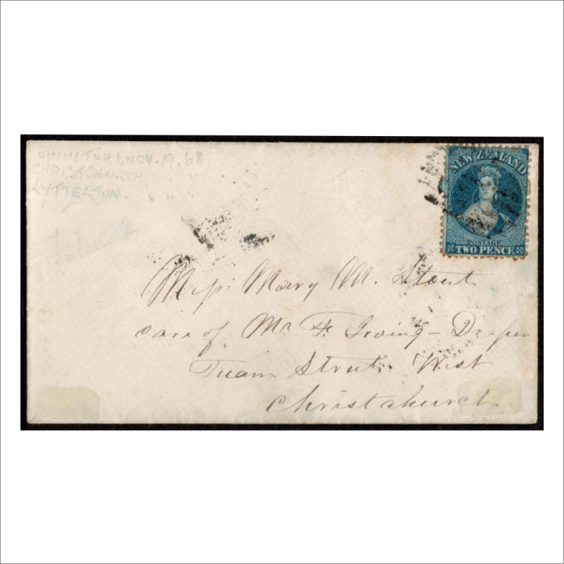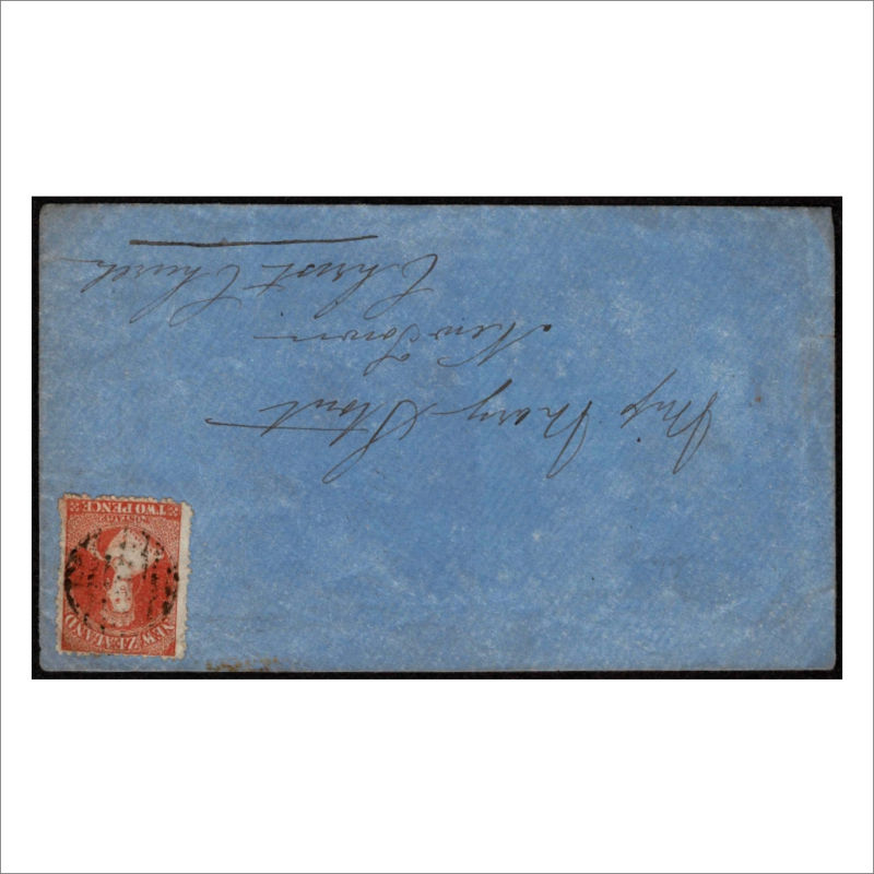 Local Cover with Perforated 2d Blue tied by Ohinitahi homemade Obliterator cancel. Backstamped Ohinitahi,Lyttelton & Christchurch cancels. Very Scarce Lyttelton local area Cover (1) (Image)
