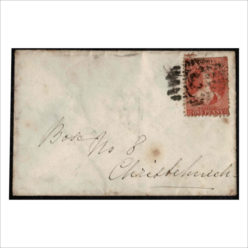 Local Drop Rate Cover with Perforated 1d Red SG 110 tied by smudged ‘C’ (Christchurch) Obliterator cancel addressed to ‘Box No 8, Christchurch’. Backstamped Christchurch. The cover has slight ageing. (1) (Image)